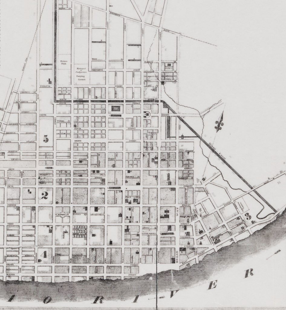 Established in the late 1780’s Cincinnati’s history is centered around it’s waterway, the Ohio river. Settlement-turned-shipping hub by English, French, and Swiss settlers – it boomed into a largely German population in the 1830’s. Pre-railway settlers, interested in expanding commerce to the great lakes, built a canal from the Ohio river in Cincinnati all the way north to Toledo – the Miami-Erie Canal. 40 feet wide, 4 feet deep and 274 miles long, the canal had intricate locks and dams to accommodate the hilly Ohio topography. The canal no longer exists but based on the map below, it looks like the Canal started where Eggleston Rd begins at the Ohio river, angled west where Reading becomes Central Pkwy East, followed Central Ave. as it angled north (where Plum becomes Central north-south) and headed north-east to Toledo from there.