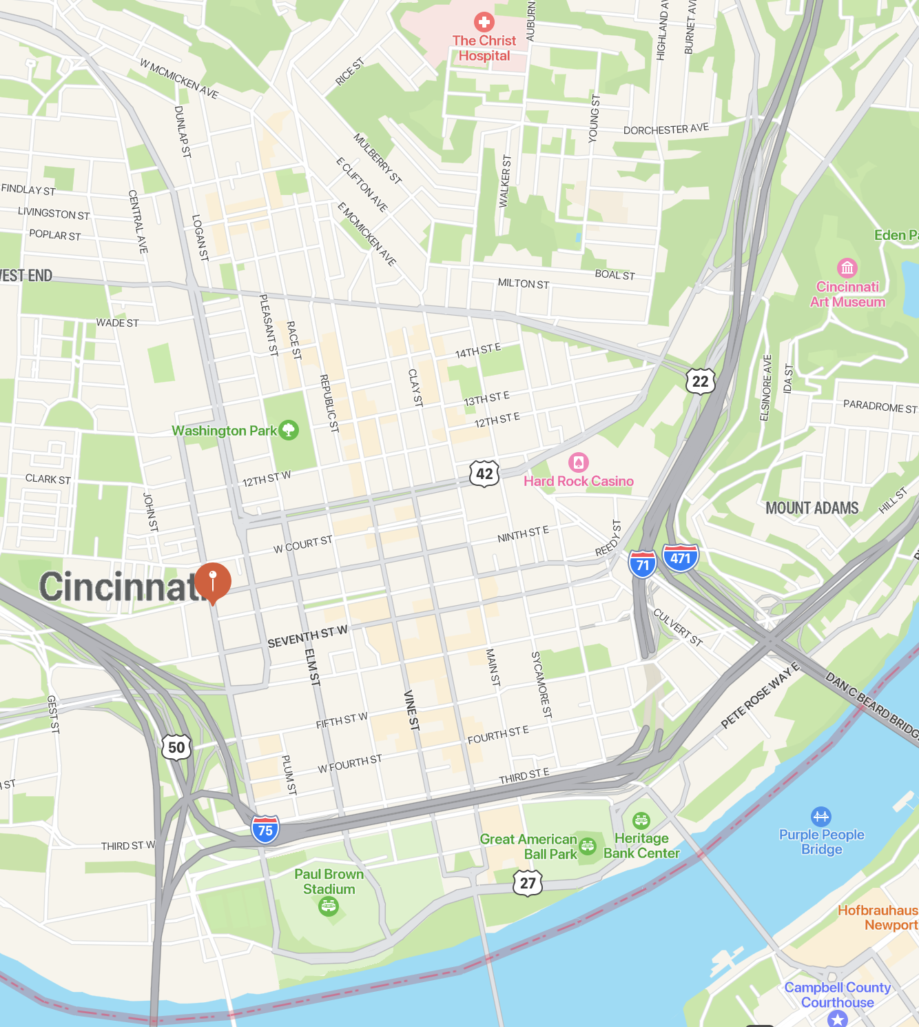 Over The Rhine (OTR) is part of downtown Cincinnati – straight north of the riverbanks & business district – mostly between Central (to the south), McMicken & Liberty (north), Main (east) and Elm (west). Downtown Cincinnati consists of a grid of numbered (east-west, starting with 3rd, going higher the further north you go) and mostly tree-named (north-south) streets. Every other street is one-way so you may get very familiar with them if you pass your destination and have to circle around.